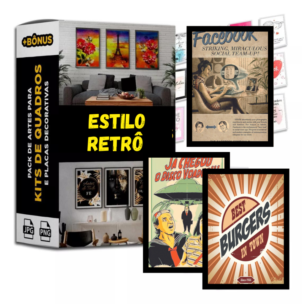 Lindas artes estilo retrô para impressão e criação de quadros fantásticos, com temas atuais em um universo retrô. Ideal para decorar sua sala, seu comércio, ou aquela área de lazer.